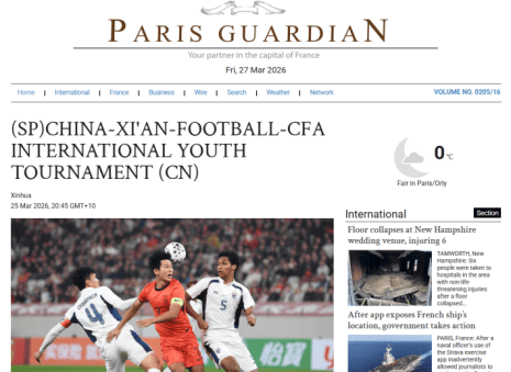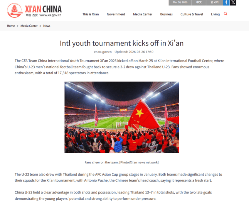 ChinaDaily(中国日报)发布报道《Intl youth tournament kicks off in Xian》(国际青年足球锦标赛在西安开幕)。报道指出,2026年中国足协中国之队国际青年足球锦标赛于3月25日在西安国际足球中心开幕,中国U-23男足在首场比赛中2-2战平泰国U-23队。报道强调,西安国际足球中心作为西北地区首座专业足球场,此次承办国际赛事彰显了西安建设赛事名城的硬核实力与体育外交活力。