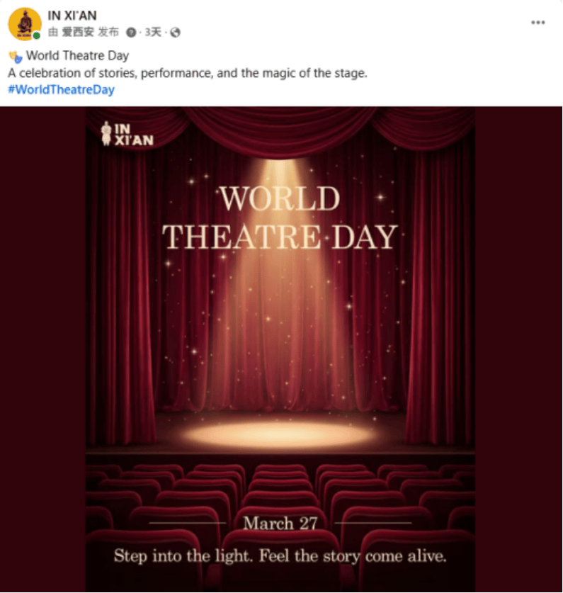 IN XI’AN在Facebook、Instagram和X平台分享世界戏剧日(World Theatre Day)主题海报,西安与戏剧渊源深厚——从唐代梨园教坊的宫廷雅乐,到易俗社百年秦腔的铿锵声韵,再到如今陕西大剧院、开元大剧院的现代演绎,这座城始终是中国戏剧版图上不可或缺的坐标。该贴文目前收获超3.4万浏览及130+次互动。
