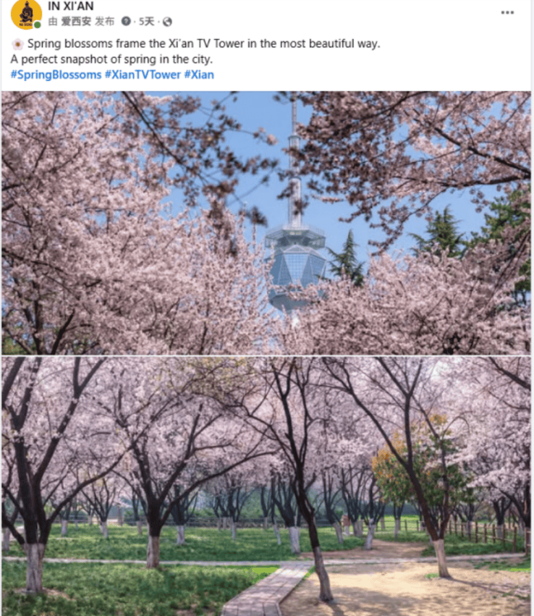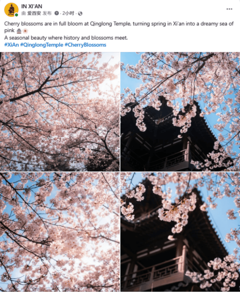 IN XI’AN在Facebook、Instagram和X平台分享青龙寺樱花盛放的美景,以粉白花海与唐代飞檐的交织画面,定格历史与繁花相遇的限定西安春景。该贴文目前收获超4.2万浏览及540+次互动。