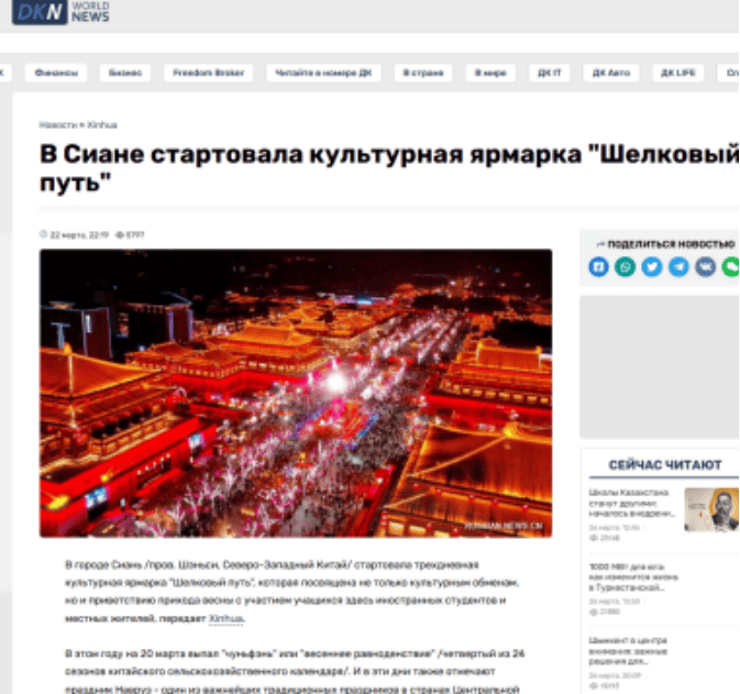 新华社在俄文专线发布稿件《Содействие культурным обменам и приветствие прихода весны:в Сиане стартовала культурная ярмаркаШелковый путь》(促进文化交流 喜迎新春:西安“丝绸之路”文化集市开市)聚焦丝路文化博览会,对活动期间的文化交流、特色产品展示、美食品鉴及民俗互动等进行了深度介绍。稿件被俄文《中国》杂志、哈萨克斯坦实业报、中国网、人民网、新华网、人民日报、世界新闻网等10家媒体采用。