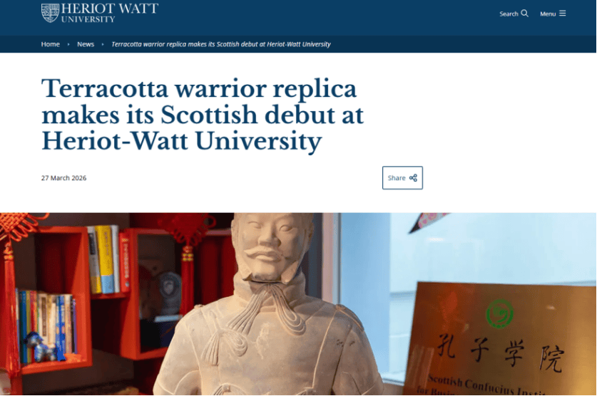 Heriot-Watt University(英国赫瑞-瓦特大学)发布报道《Terracotta warrior replica makes its Scottish debut at Heriot-Watt University》(兵马俑复制品在赫瑞-瓦特大学完成苏格兰首秀)。报道指出,一尊兵马俑将军俑复制品在赫瑞-瓦特大学爱丁堡校区揭幕,这是该复制品首次在苏格兰公开展出。这尊雕像由西安市赠予爱丁堡市,以纪念两城结好40周年,现由爱丁堡市长转赠给赫瑞-瓦特大学,陈列于其孔子学院内。作为古丝绸之路起点,西安正以兵马俑等文化符号搭建国际交流桥梁,让世界读懂中国的开放与包容。