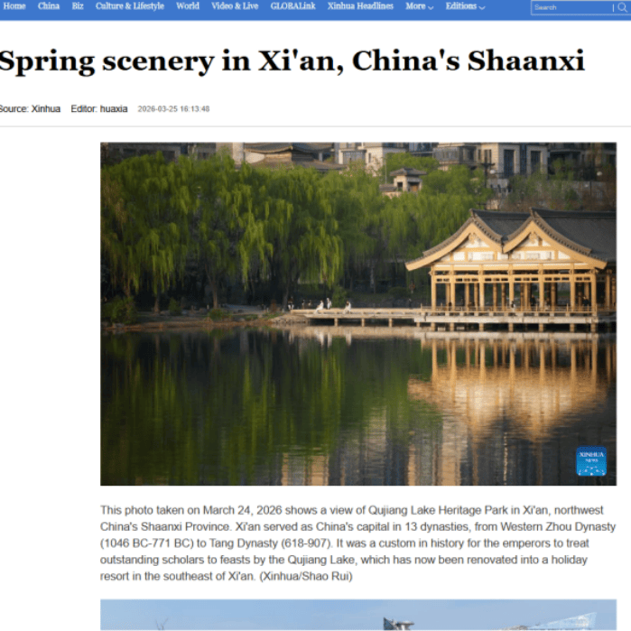 新华社在英语、西语专线发布稿件《Spring scenery in Xian, Chinas Shaanxi》(曲江池畔春意盎然)通过组图的形式,展示了西安曲江池遗址公园内的春色胜景,凸显了人与自然和谐共生的宜居城市形象。稿件被光明网、人民日报、新华网、、等13家媒体采用。