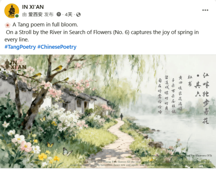 IN XI’AN在Facebook、Instagram和X平台分享唐诗海报《江畔独步寻花·其六》。呈现杜甫笔下“黄四娘家花满蹊,千朵万朵压枝低”的春日胜景,传递千年诗意与长安春色的交融之美。该贴文目前收获超3.6万浏览及610+次互动。