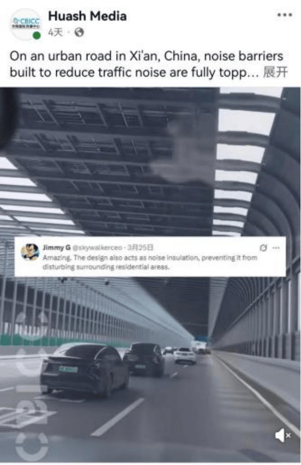 Huash Media发布《西安这条“光伏长廊”获外国网友称赞》视频,介绍西二环道路的隔音屏障上安装的分布式光伏板,推介城市空间与绿色能源的典型案例,外国网友对此方案给予高度评价。该视频在Facebook平台获得46万+的播放量,互动次数100+。