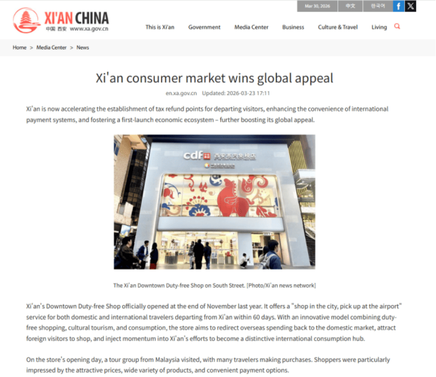 China Daily(《中国日报》)发布报道《Xian consumer market wins global appeal》(西安消费市场赢得全球青睐)。报道指出,西安正加速推进离境退税点建设,提升国际支付系统便利性,并培育首发经济生态,以进一步提升全球吸引力。西安市内免税店于去年11月底正式开业,通过免税购物+文化旅游+消费的创新模式,旨在将海外消费引流回国内市场,吸引外国游客来西安购物,助力西安打造独具特色的国际消费中心。
