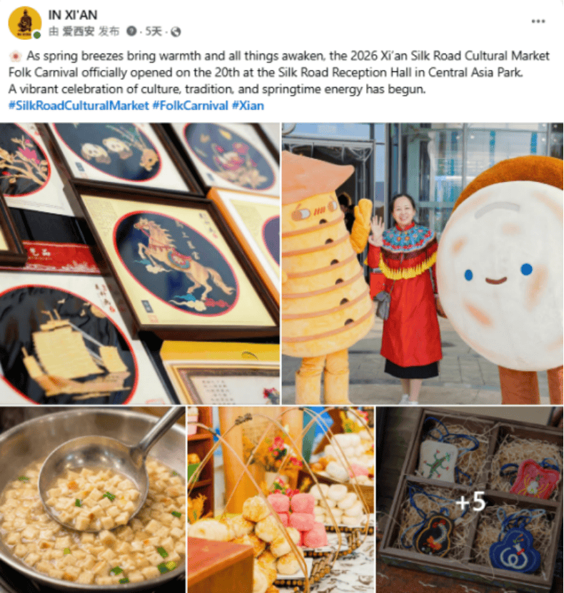 IN XI’AN在Facebook、Instagram和X平台分享丝路文化集市民俗嘉年华精彩瞬间。来自10多个国家的50多位外籍人士与西安市民齐聚中亚公园·丝路会客厅,共赏合阳提线木偶戏与中亚传统舞蹈,体验麦秸画、剪纸、澄城刺绣等非遗项目。该帖文目前收获超2.5万浏览及810+次互动。