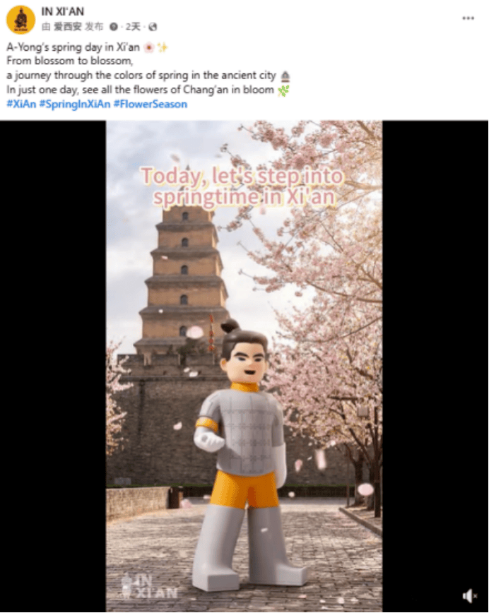 IN XI’AN在Facebook、Instagram、YouTube和TikTok平台分享AIGC阿俑西安春日赏花指南视频。通过AIGC技术让“阿俑”与真实花景互动,带海外受众一日看尽长安花,感受千年古都的春日诗意与数字文旅的创新表达。该贴文目前收获超12.2万次浏览及670+次互动。