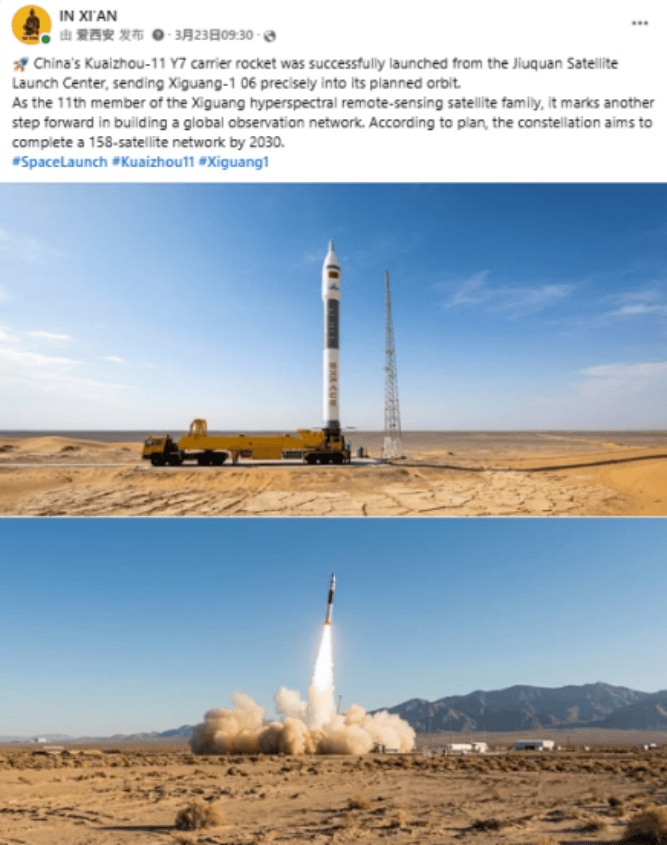 IN XI’AN在Facebook、Instagram和X平台介绍快舟十一号遥七运载火箭成功发射西光一号06星。西光一号06星由西安中科西光航天科技集团有限公司自主研制。西安作为“中国航天动力之乡”和以航天产业为特色的国家级经济技术开发区,已形成从火箭研制、卫星制造到数据应用的全产业链布局。该帖文目前收获超3.3万浏览及350+次互动。