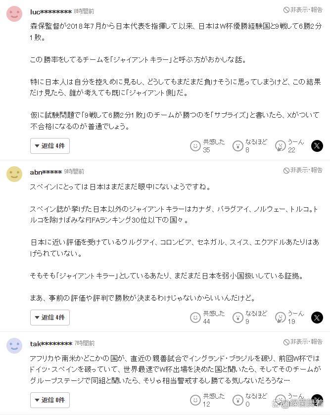 另一位球迷则略带讽刺地说道:“看来西班牙媒体根本没有把日本队放在眼里。他们所列举的其他“巨人杀手”,都是国际足联排名在第三十位开外的国家。而与日本队排名相近的乌拉圭、哥伦比亚、塞内加尔等强队却榜上无名,归根结底,他们仍然将日本队视为弱旅。”还有球迷表示:“看来日本队要被世界足坛公认为“顶级强队”,还需要时间。但无论别人如何看待,我都会一如既往地支持日本队,只是对这种居高临下的姿态感到非常不满。”